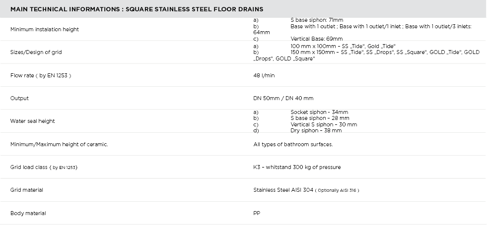 पेस्टन कॉनफ्लुओ स्टैंडर्ड क्लासिक फ़्लोर ड्रेन के 80 से अधिक विभिन्न मॉडल पेश करता है। सभी मॉडलों की बॉडी प्लास्टिक से बनी होती है और ग्रिड स्टेनलेस स्टील या टेम्पर्ड ग्लास से बनी होती है, जिसे हम विभिन्न डिजाइनों और आकारों में + पूर्ण सहायक उपकरण और कंक्रीट फर्श डालने के दौरान सुरक्षा के लिए सेट करते हैं।